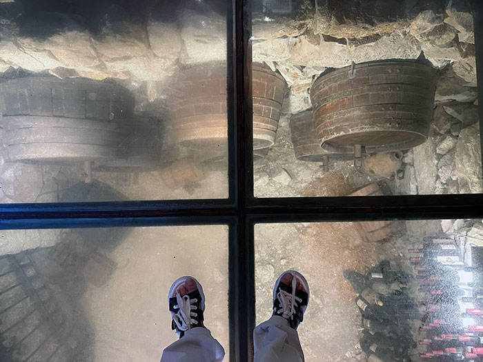 При реставрации темплерского квартала в этом доме обнаружили винный погреб и сделали прозрачный пол, чтобы было видно бочки |