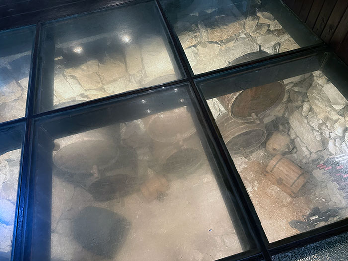 При реставрации темплерского квартала в этом доме обнаружили винный погреб и сделали прозрачный пол, чтобы было видно бочки |
